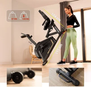 De HS-120L staat stevig dankzij verstelbare stelvoeten die oneffenheden in de vloer compenseren. Voor verplaatsen of opbergen na gebruik zitten er transportwielen geïntegreerd in de vooras, zodat je de fiets moeiteloos kunt verschuiven. Let op: een vloermat is niet inbegrepen.